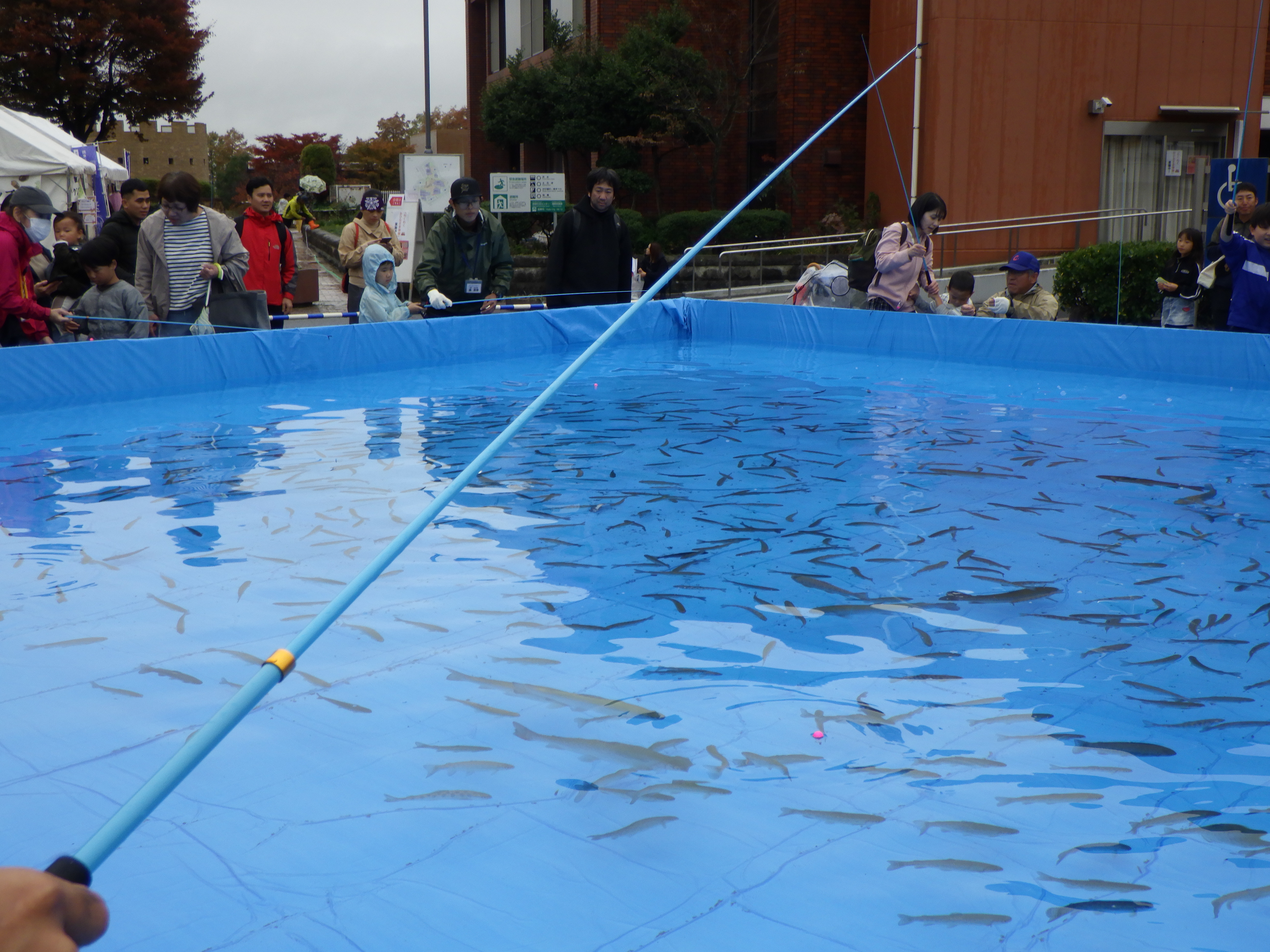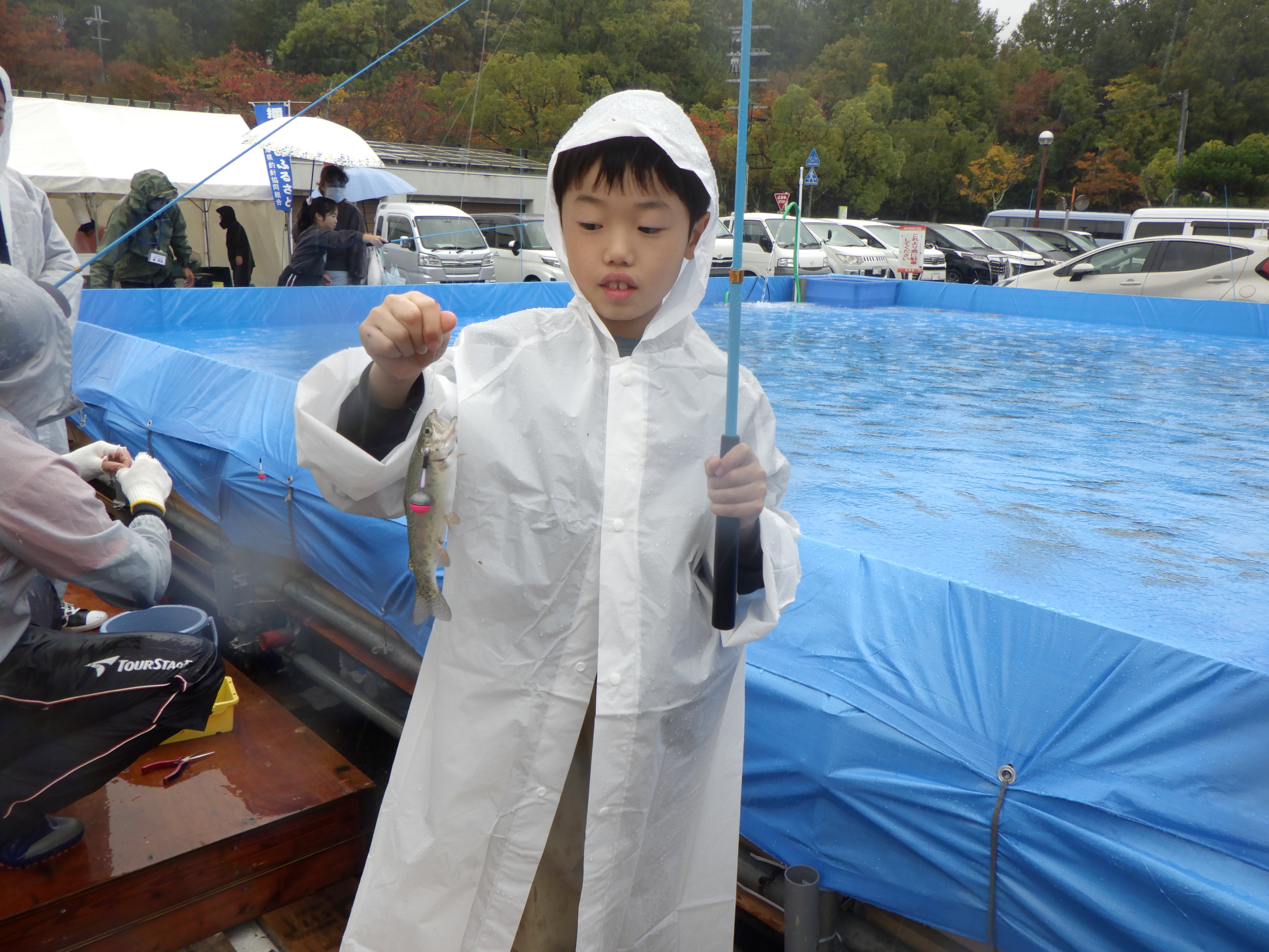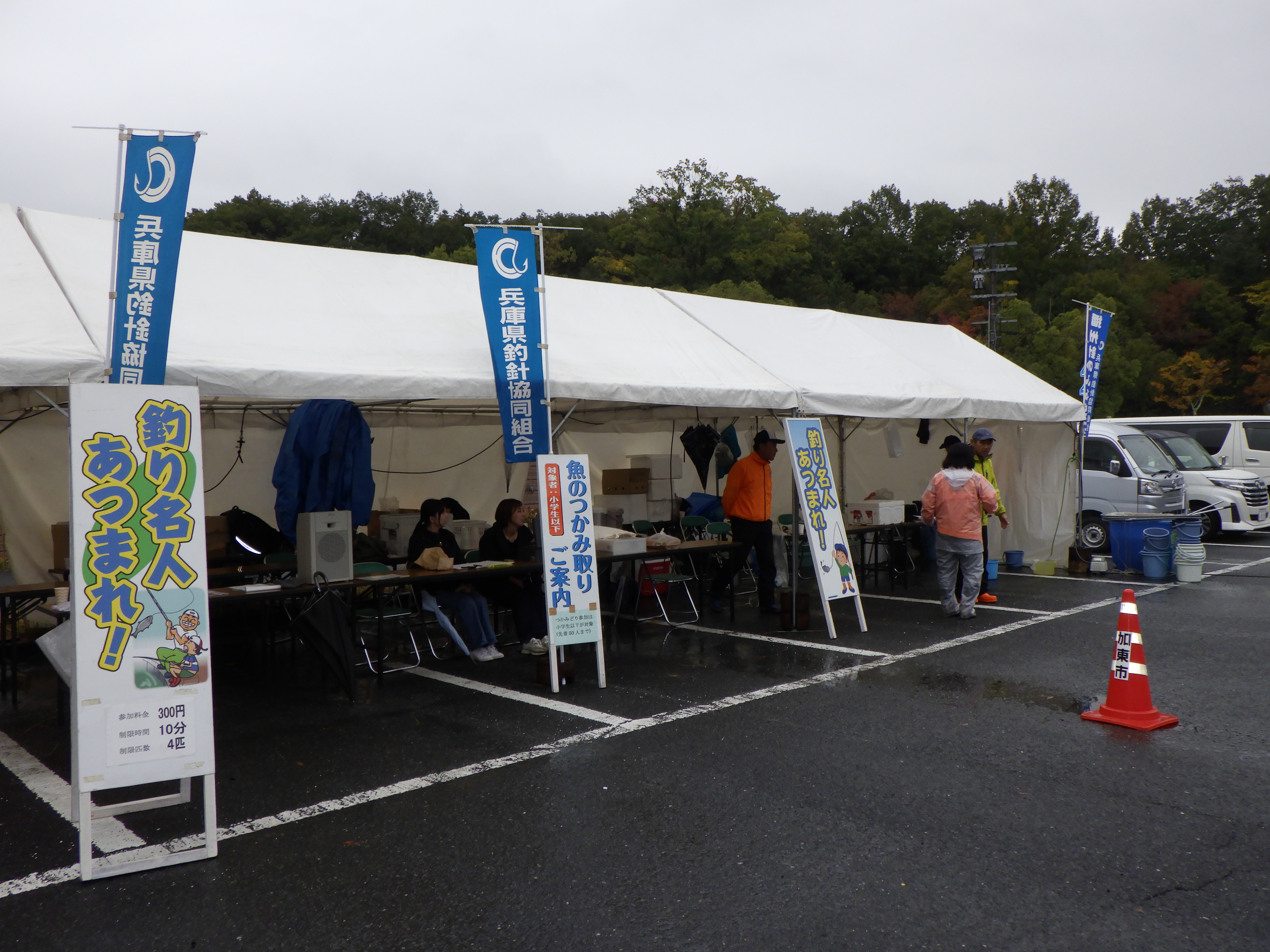 加東市秋のフェスティバル2025が11月9日(日)播磨中央公園で開催されました。 今年も兵庫県釣針協同組合は「釣り名人あつまれ」のブースを出展・運営しました。 あいにくの雨でしたが、参加者はアマゴ・ニジマス釣りを楽しく過ごしていました。 午後3時から水を抜いた釣り堀で子供たちは「掴み取り」で魚を追いかけて喜んで いました。